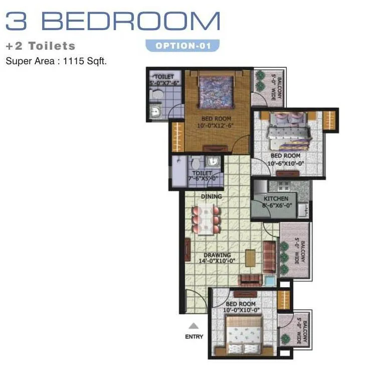 | 3 BHK + 2T | 1145 Sq.Ft. | |