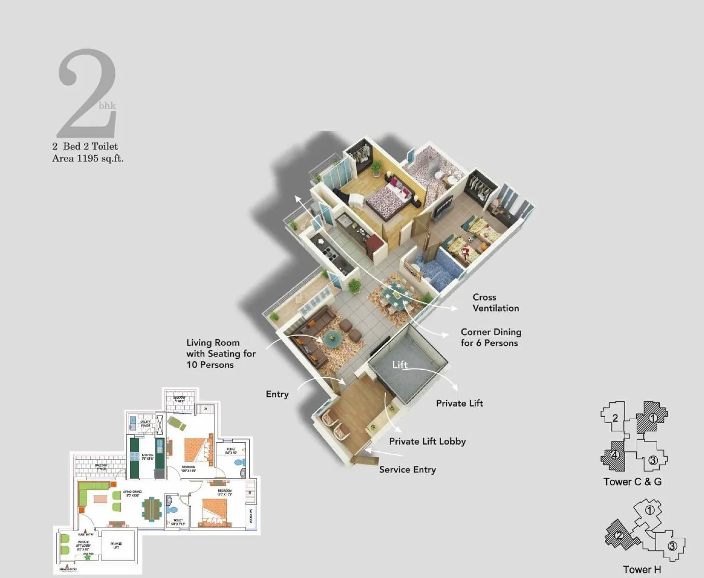 | 2 BHK + 2T | 1195 Sq.Ft. | |