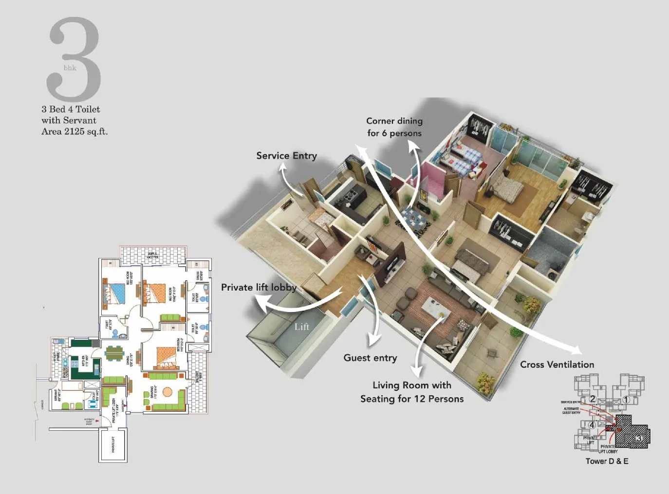 | 3 BHK + 4T + Servant | 2125 Sq.Ft. | |