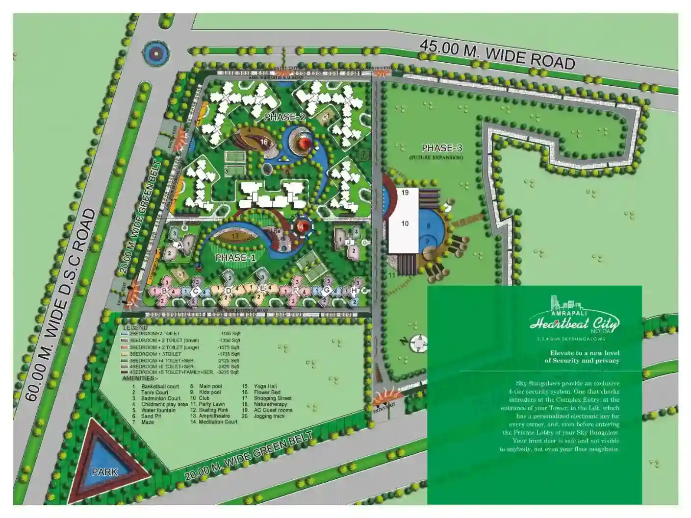 Amrapali Heartbeat City has a site plan that combines luxury, comfort and convenience. The project is located on 25 acres and includes numerous blocks with spacious and well-ventilated flats. This pattern ensures ample space for trees and open spaces, creating a calm living environment. The heart of the venture consists of an exquisite clubhouse, a swimming pool and neatly designed gardens, offering the residents an ideal place to wind down. Tennis courts and basketball are among other sports facilities cleverly positioned so as to foster an active lifestyle. The development also encompasses jogging tracks, kid's corners, as well as zones set aside specifically for older members of society.