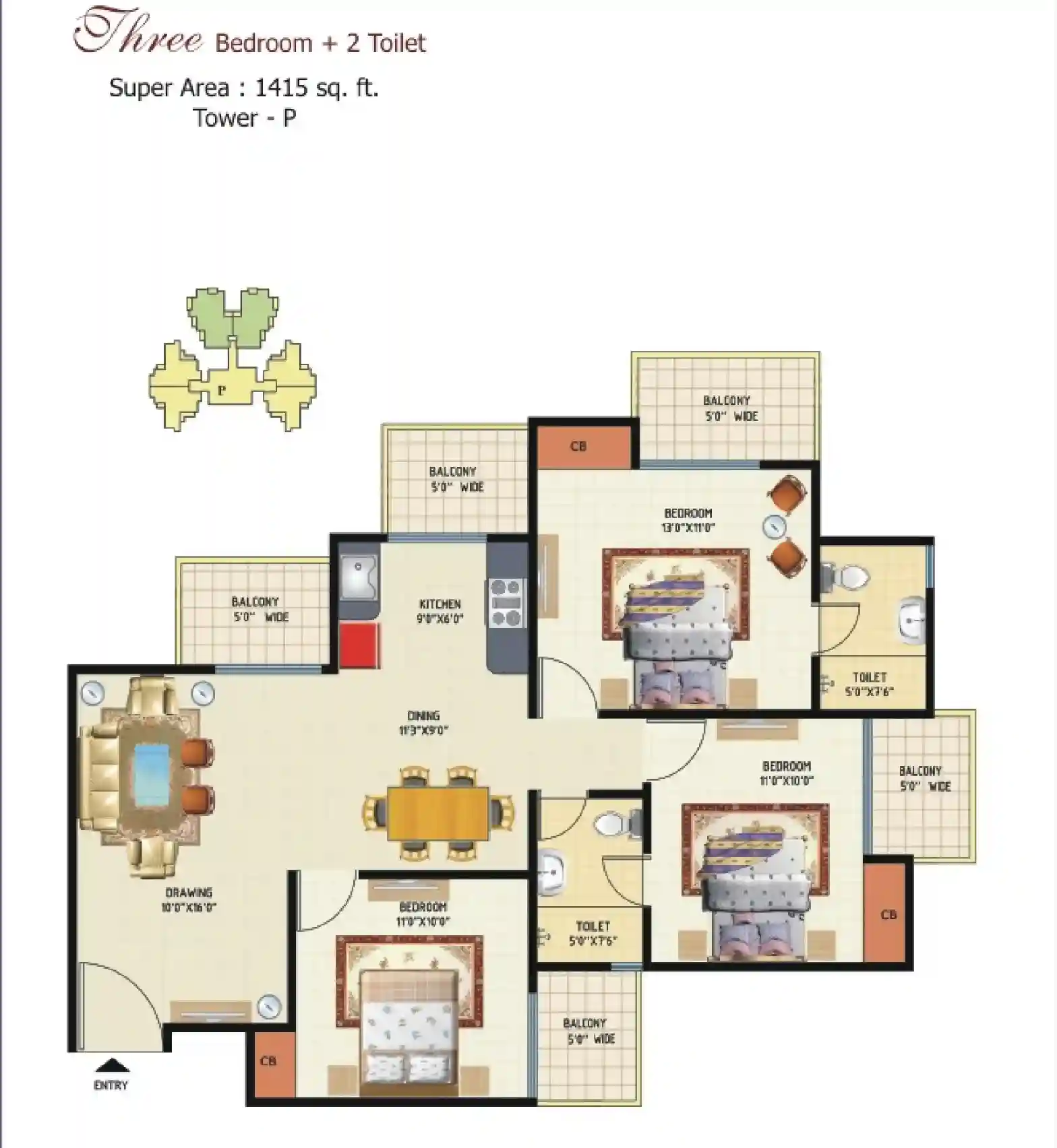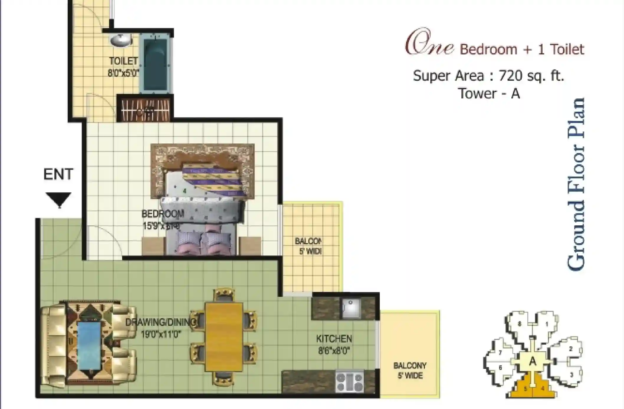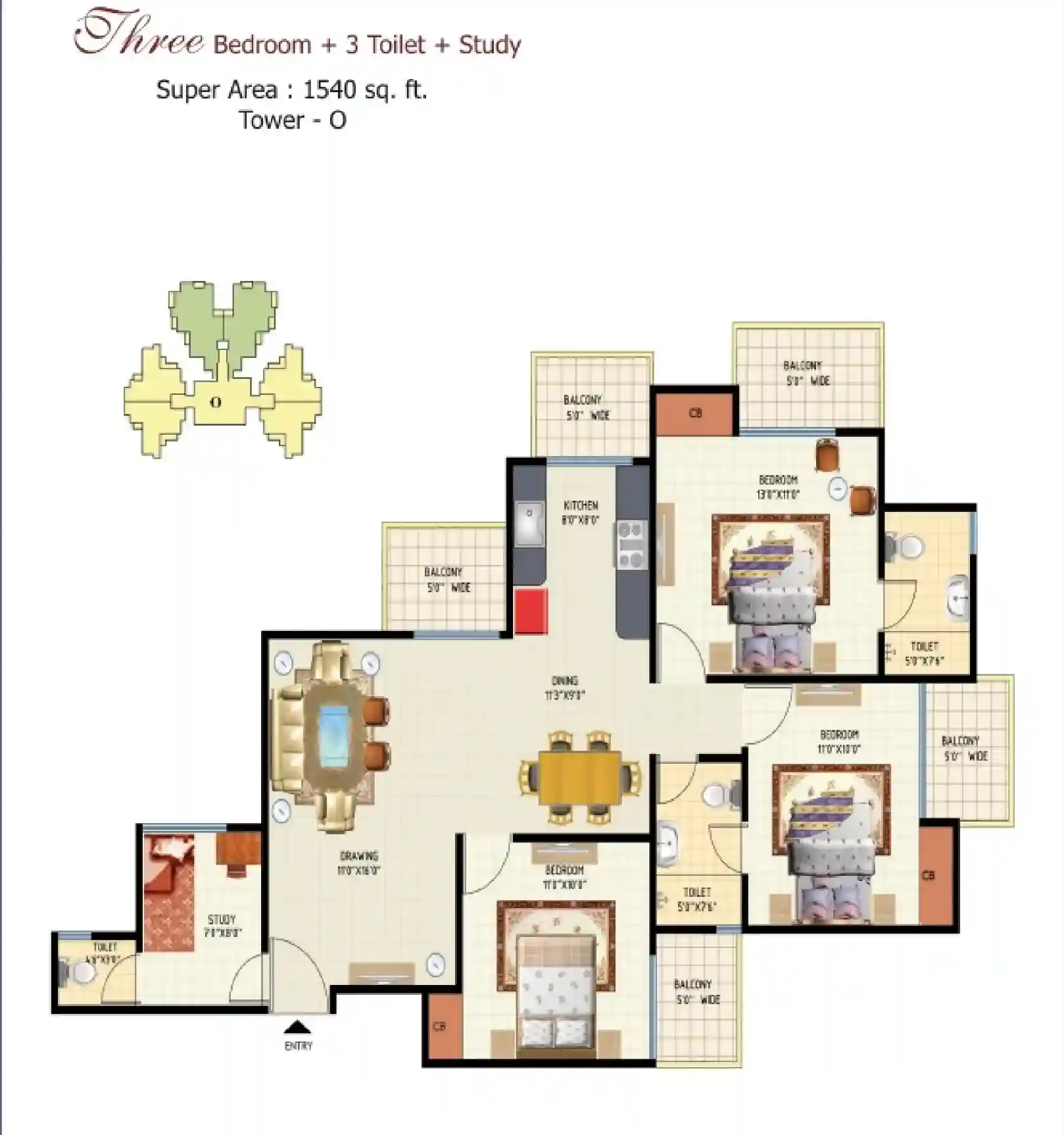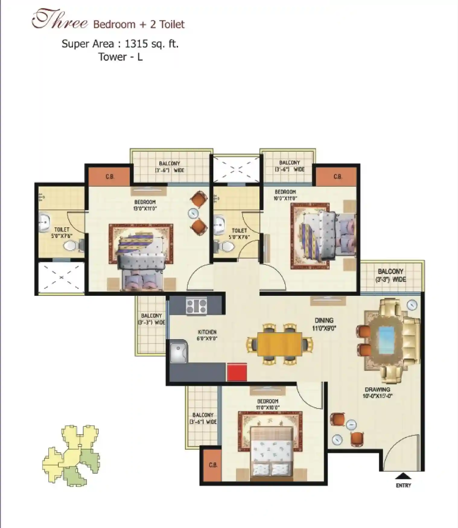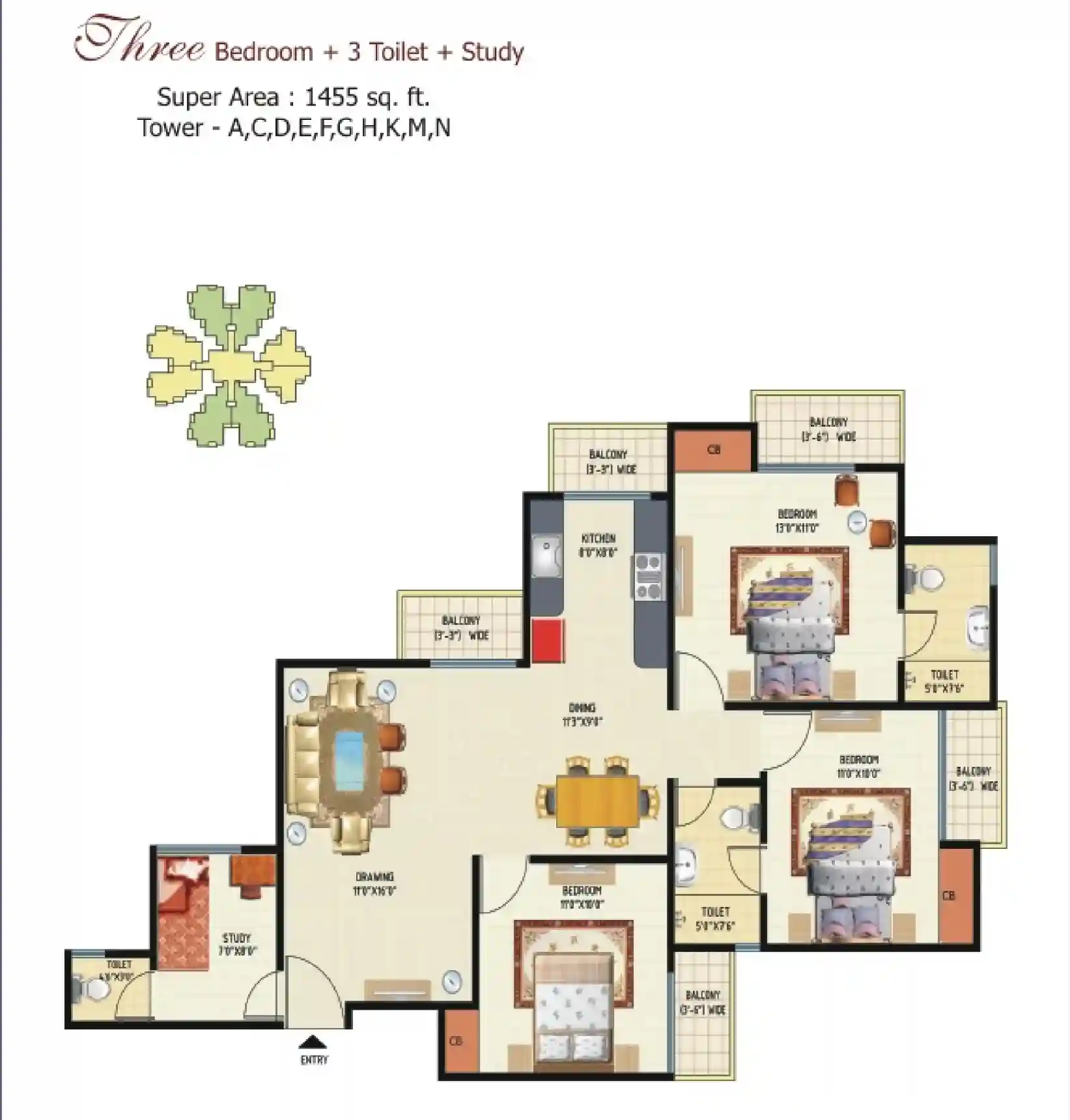 | 3 BHK + 3T | 1380 Sq.Ft. |