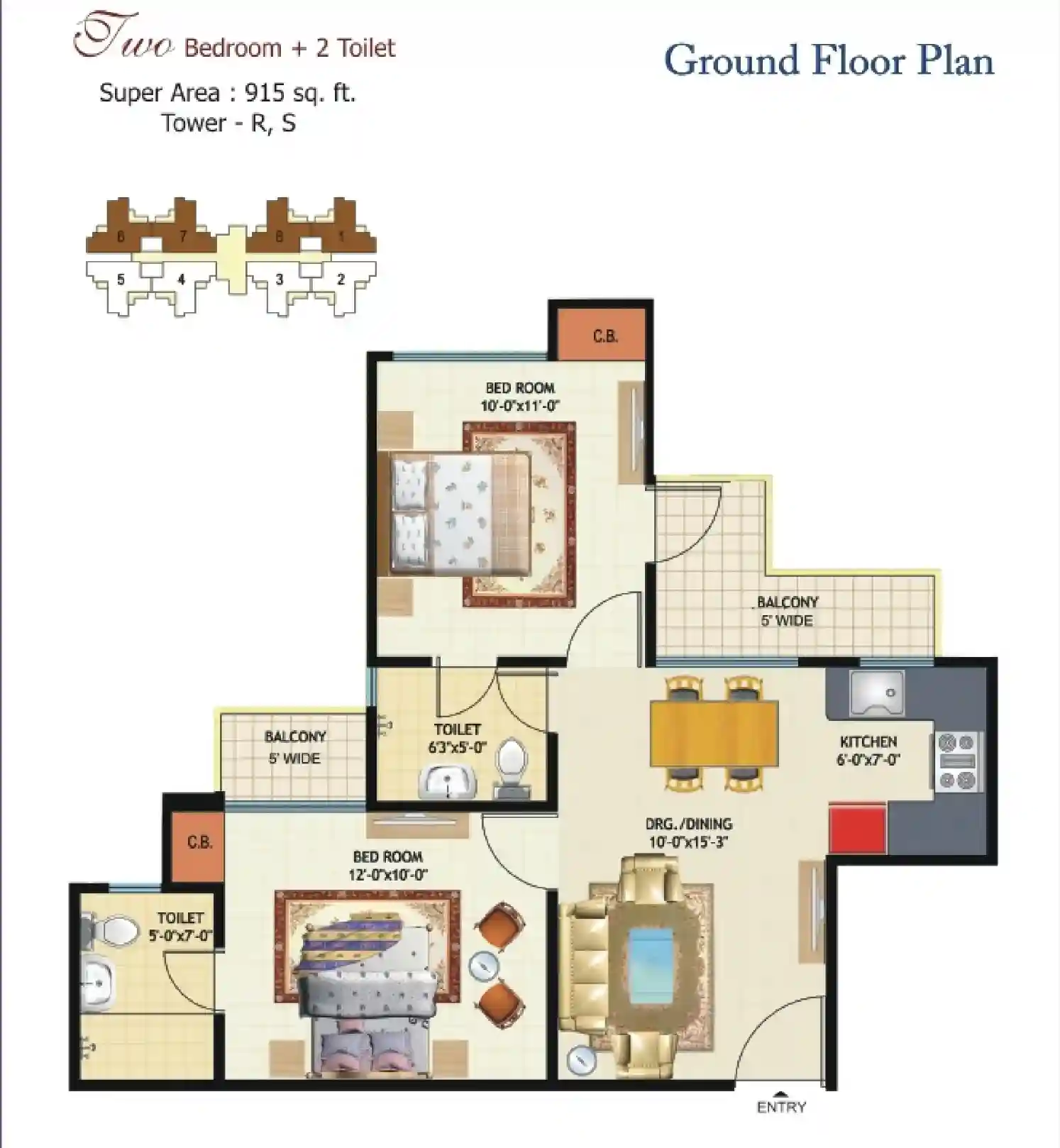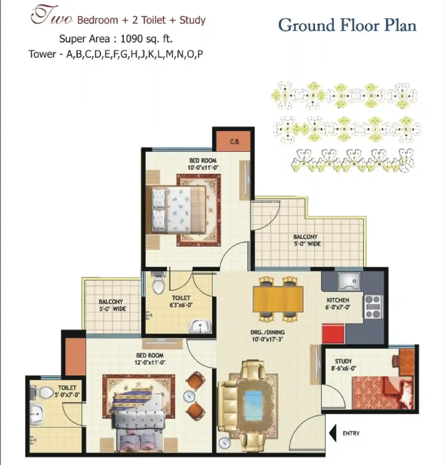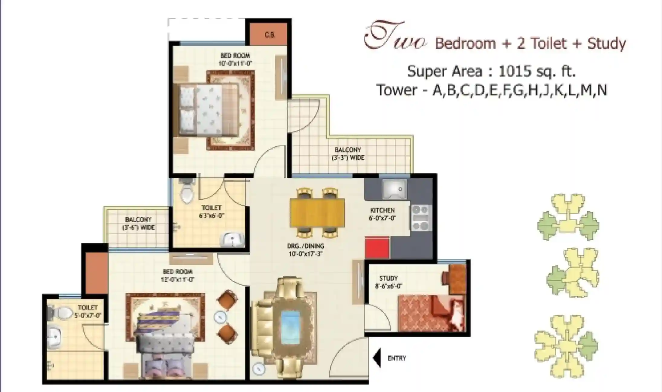 | 2 BHK + 2T + Study | 915 Sq.Ft. | |