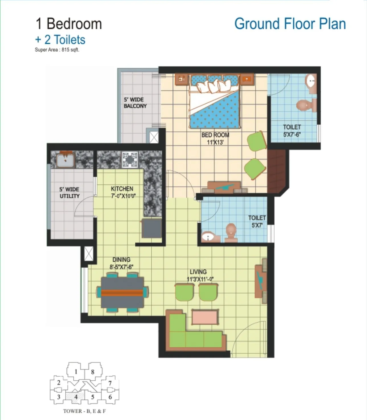| 1 BHK + 2T | 815 Sq.Ft. | |