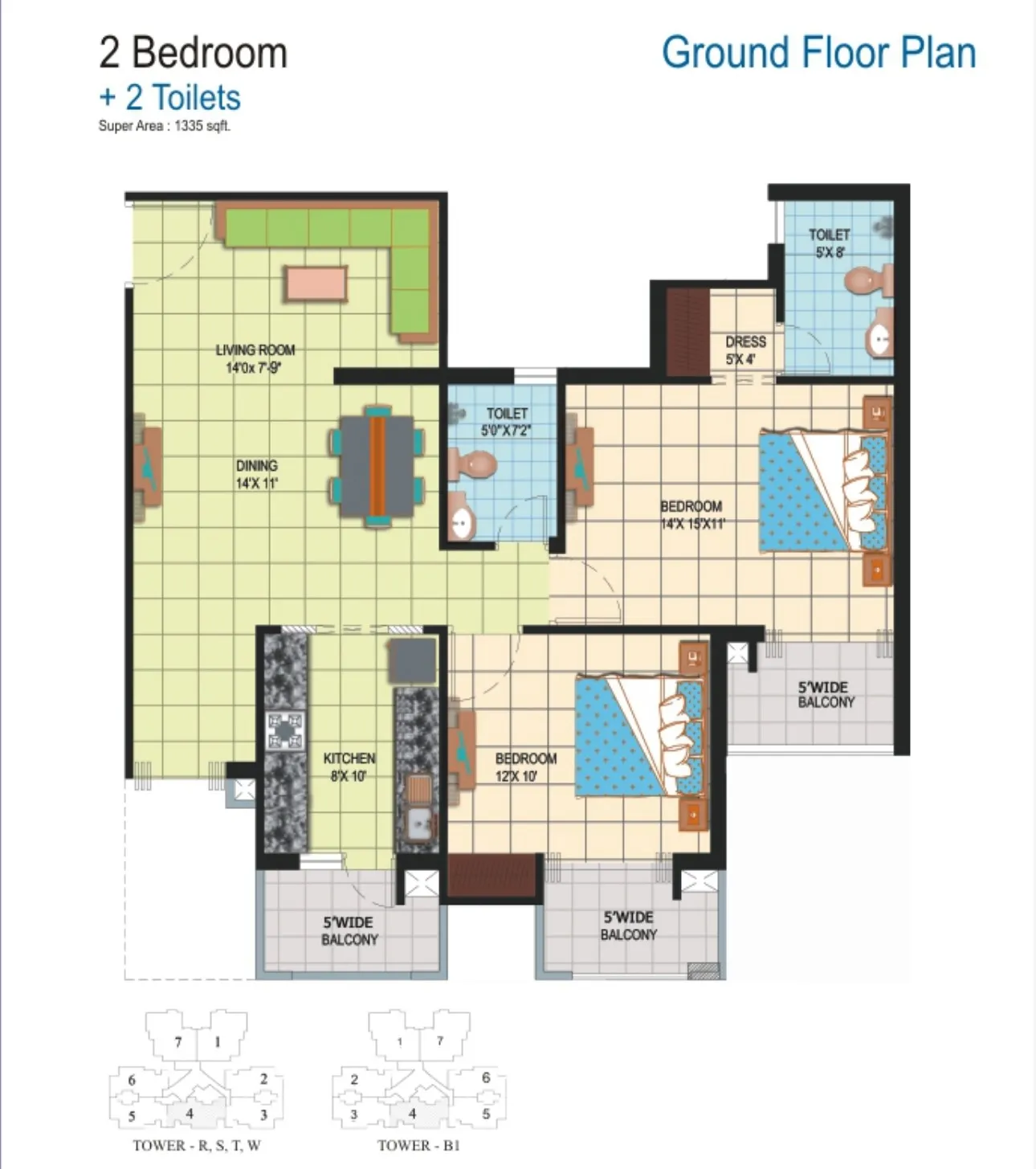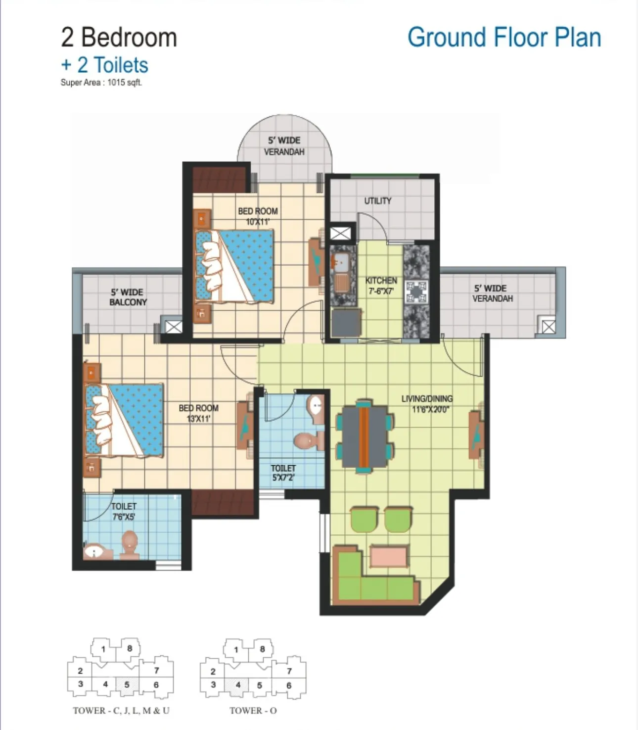 | 2 BHK + 2T | 1015 Sq.Ft. | |