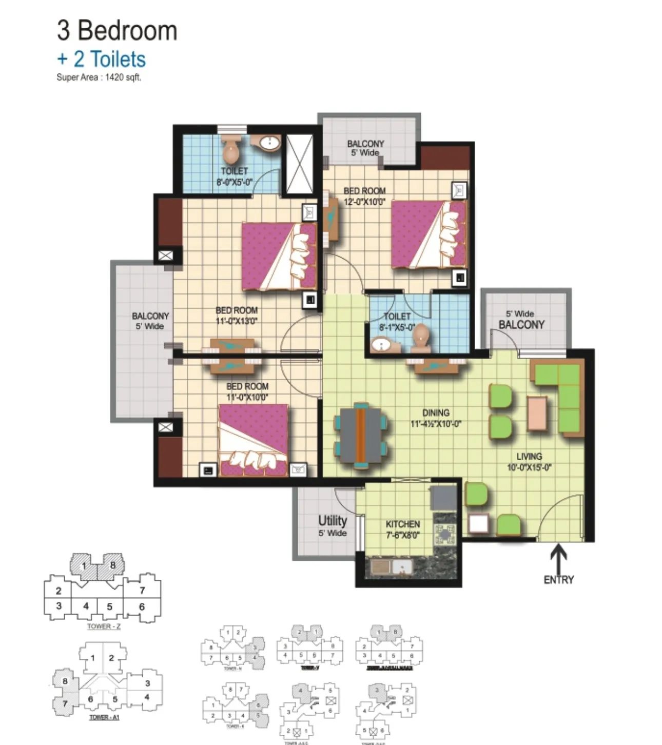 | 3 BHK + 2T | 1420 Sq.Ft. | |