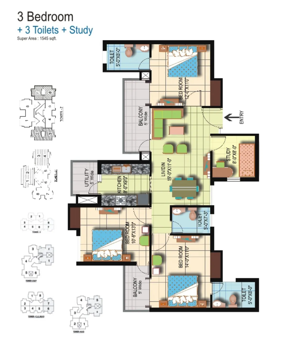 | 3 BHK + Study | 1545 Sq.Ft | |