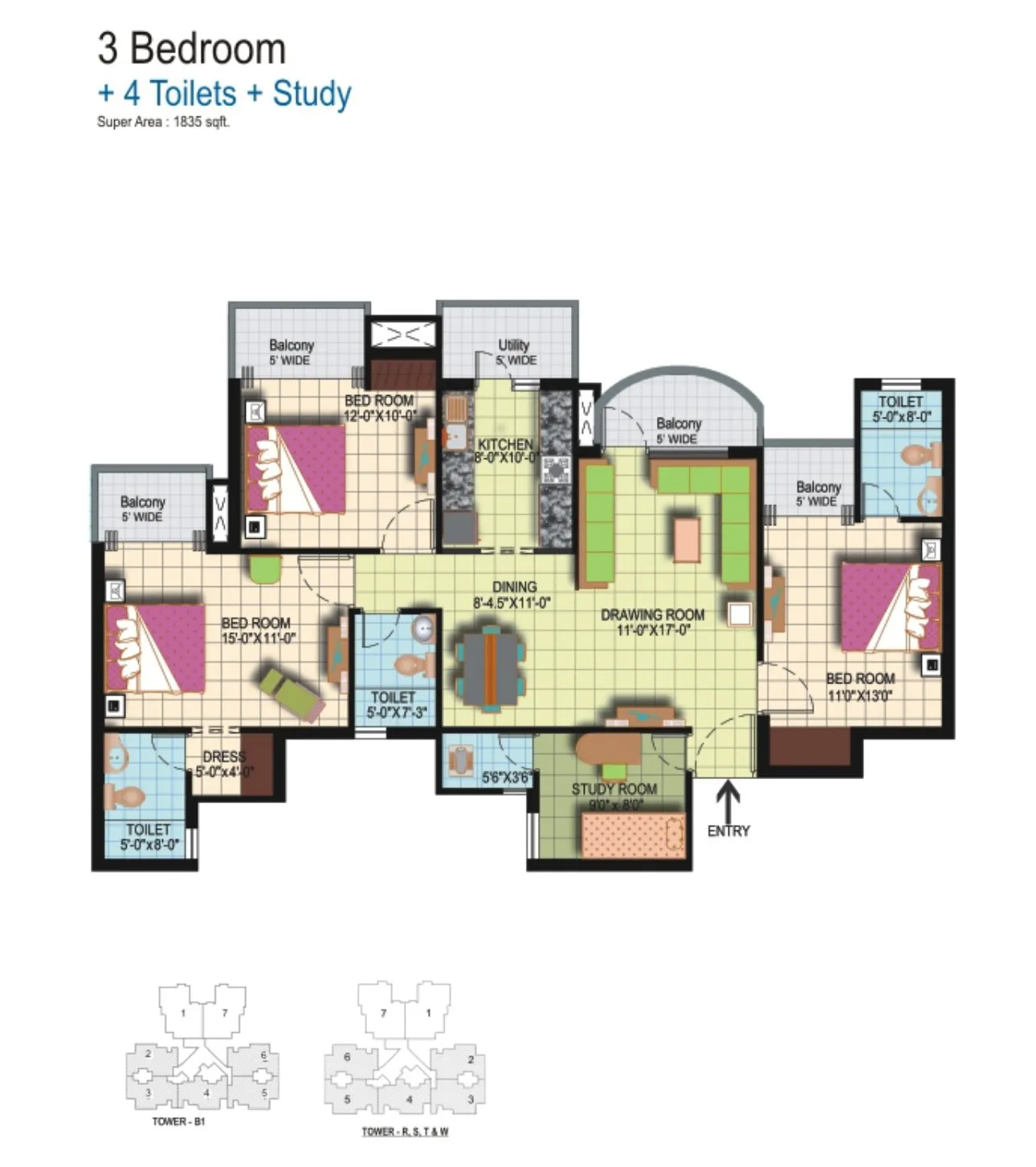 | 3 BHK + Study | 1835 Sq.Ft | |