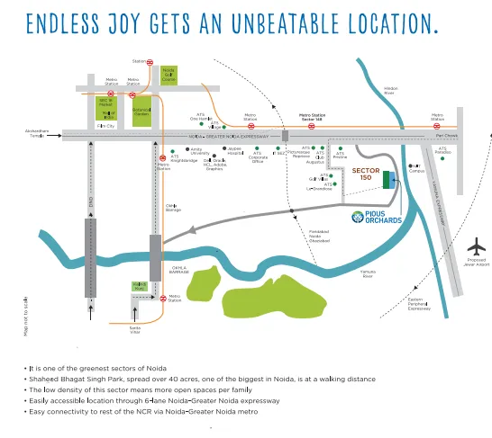 The ATS Homekraft Pious Orchards project is situated in Sector 150 of Noida, a prime location offering convenient access to the Yamuna Expressway and the Noida-Greater Noida Expressway. Apart from this, it is in close proximity to several prominent landmarks and developments such as ATS LE-GRANDIOSE, ATS PRISTINE GOLF VILLAS, Solitaire at Godrej Nest, Antriksh Grand View, Eureka Park - Tata Value Homes, Eldeco Cricket Ground, Shaheed Bhagat Singh Park, RSK Smart City Jain Temple and Gautam Buddha University (Delhi NCR). This strategic location provides residents seamless connectivity to major highways, commercial hubs and recreational areas. Moreover, the upcoming metro station in the surrounding area will further enhance the connectivity options for residents.