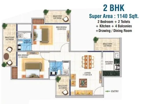 | 2 BHK + 2T | 1140 Sq.Ft. | |