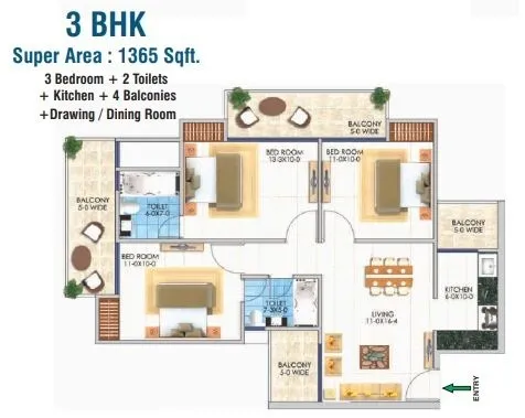 | 3 BHK + 2T | 1365 Sq.Ft. | |