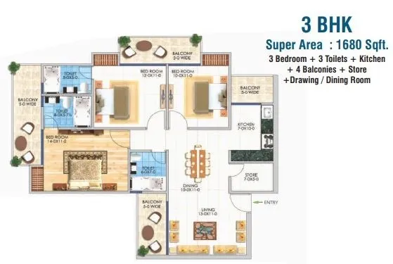 | 3 BHK + 3T | 1680 Sq.Ft. | |