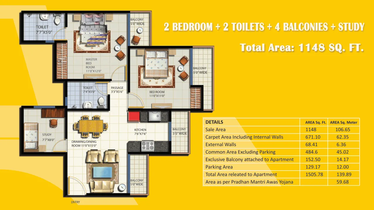 | 2 BHK + 2T + Study | 1148 Sq.Ft. | |