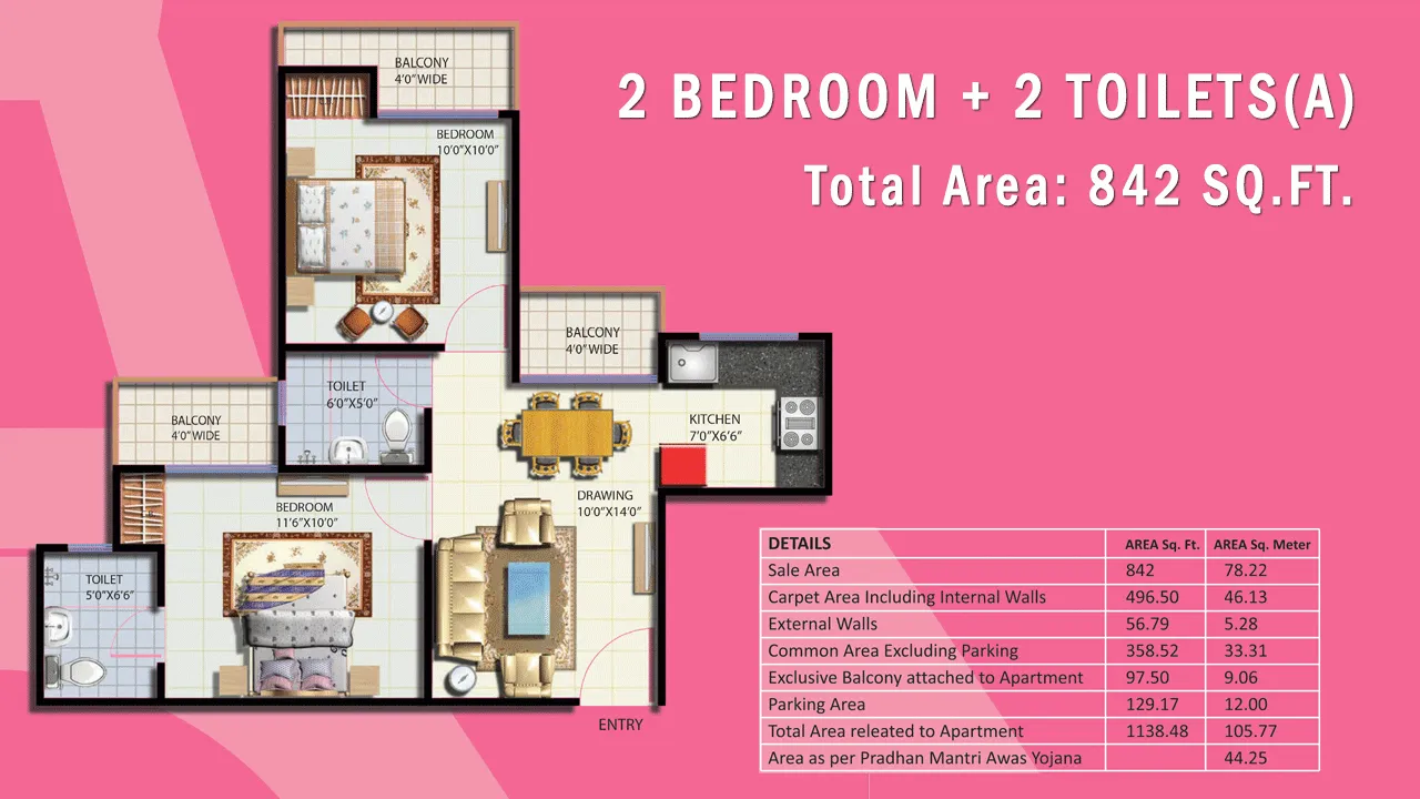 | 2 BHK + 2T | 842 Sq.Ft. | |