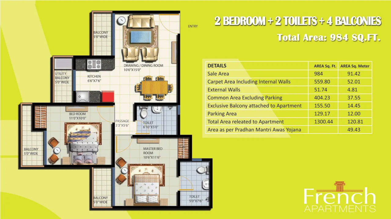 Ans: French Apartment offers 2 BHK, 3 BHK & 4 BHK Apartments in Noida Extension with sizes ranging from 882 Sq.Ft To 2100 Sq.Ft.
