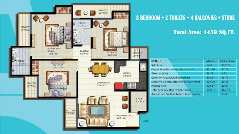 | 3 BHK + 3T | 1459 Sq.Ft. | |