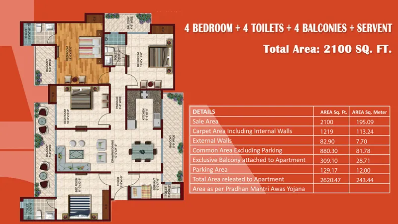 | 4 BHK + 4T + Study | 2100 Sq.Ft. |