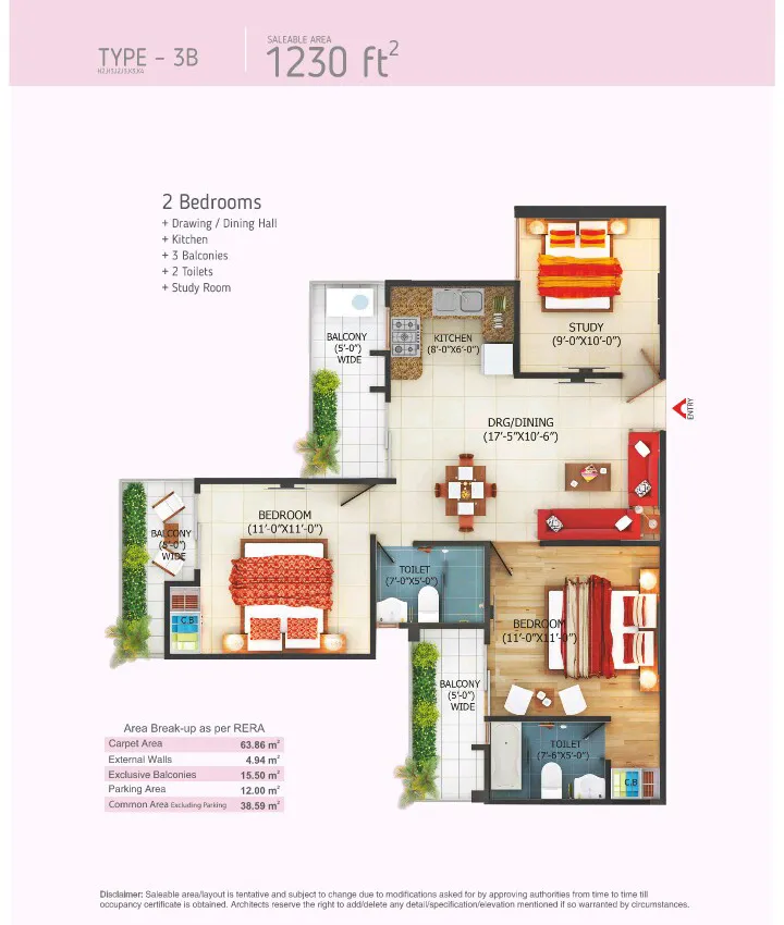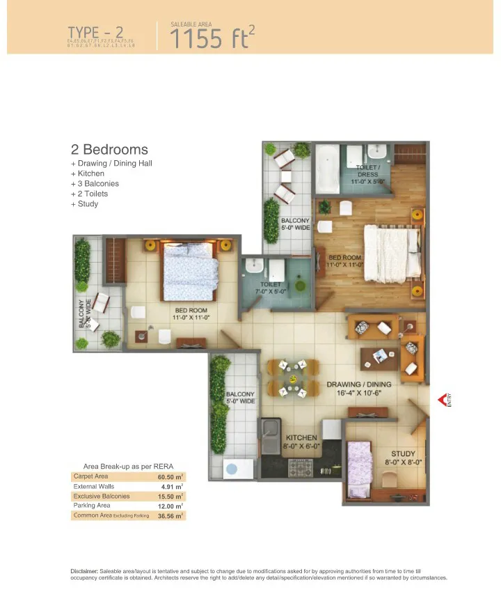 | 2 BHK + 2T + Study | 1148 Sq.Ft. | |