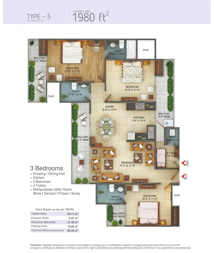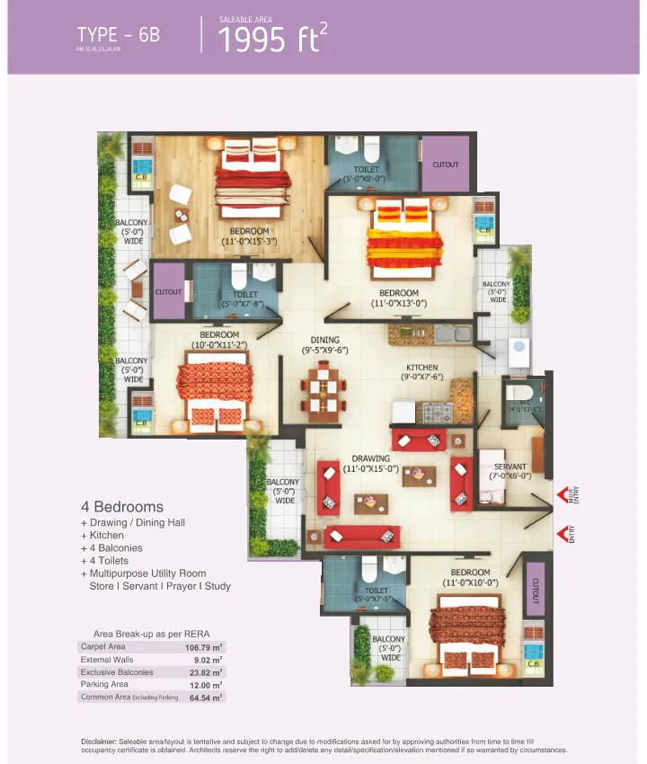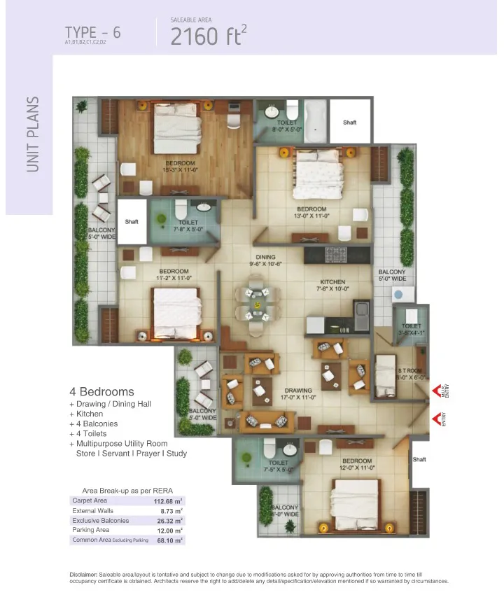 | 4 BHK + 4T + Study | 2100 Sq.Ft. |