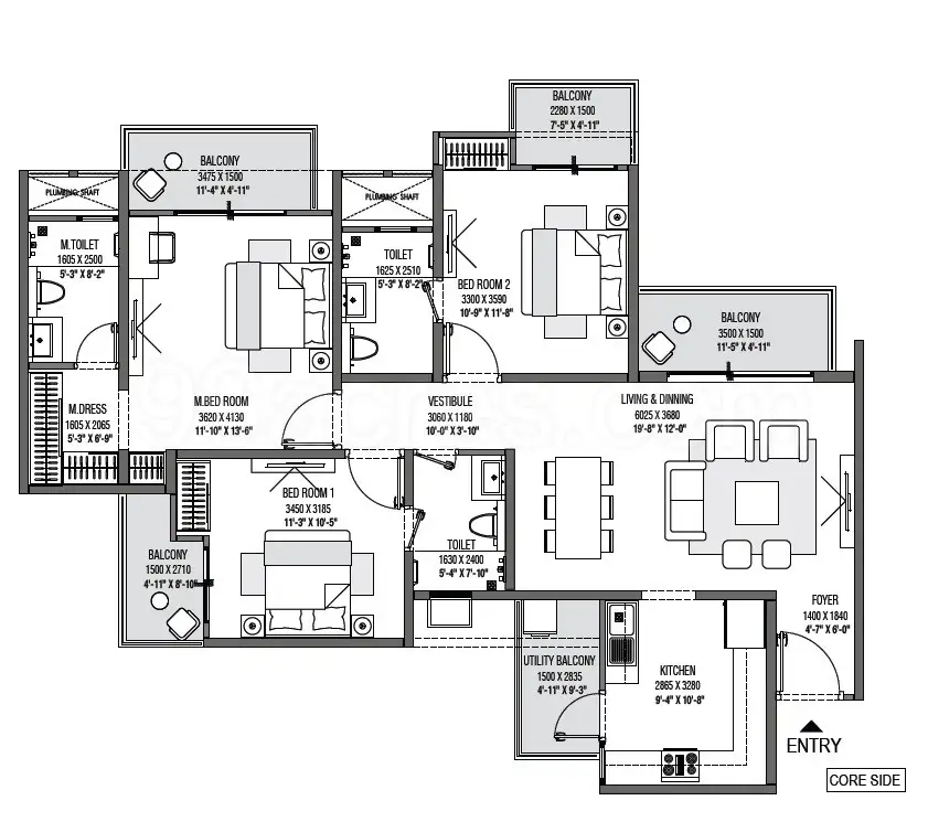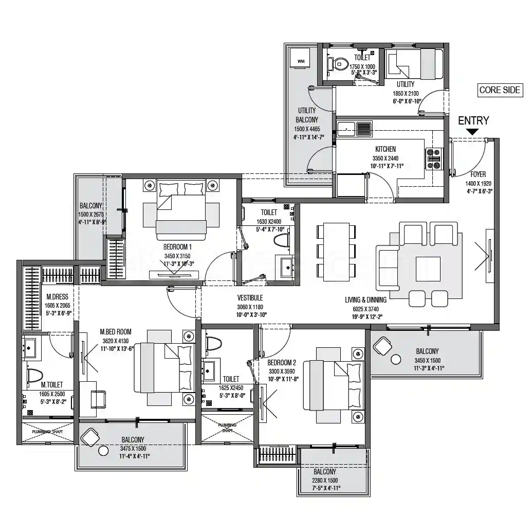 | 3 BHK + 3T | 1851 Sq.Ft. | |