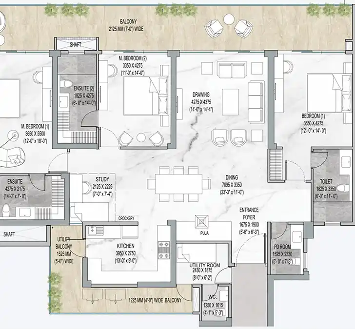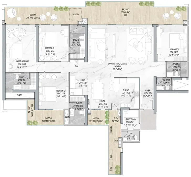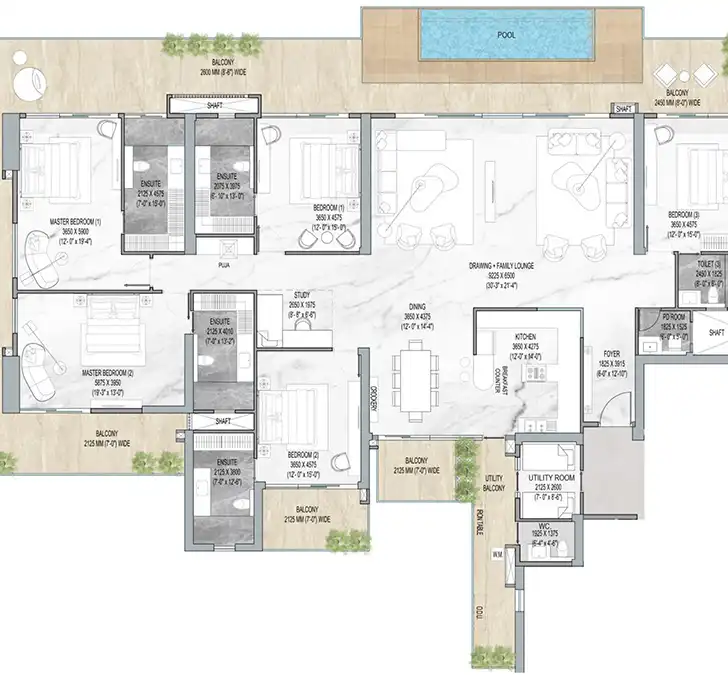 Ans: M3M The Cullinan offers 3 BHK & 4 BHK Apartments in Noida with a size range of 3200 Sq.Ft To 6200 Sq.Ft.