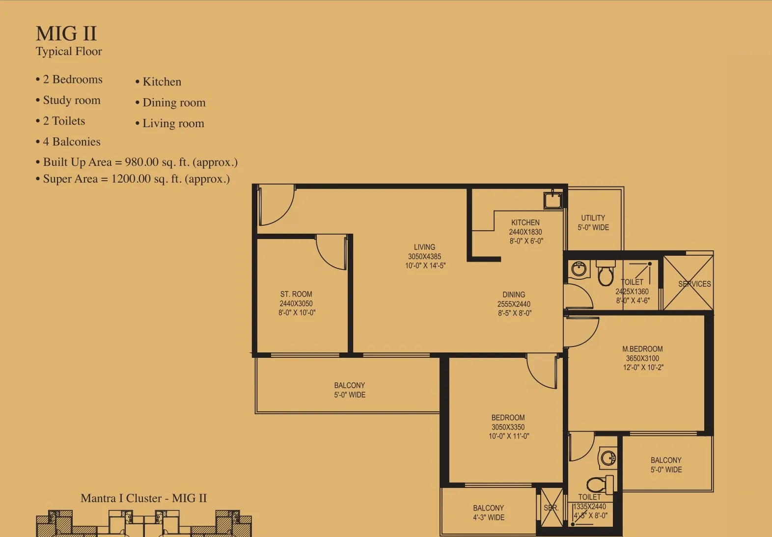 | 2 BHK + 2T + Study | 1200 Sq.Ft. | |