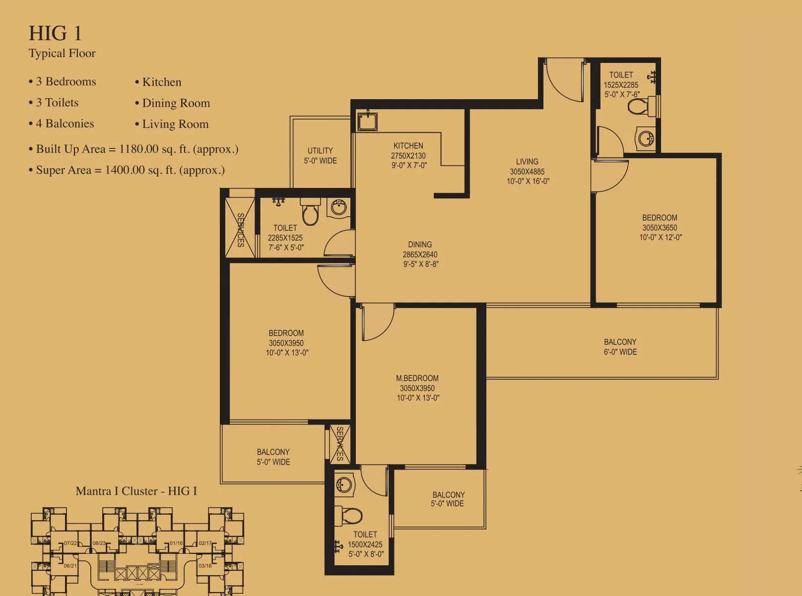 | 3 BHK + 3T | 1400 Sq.Ft. |