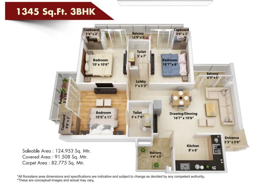 | 3 BHK + 2T | 1345 Sq.Ft | |
