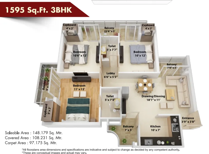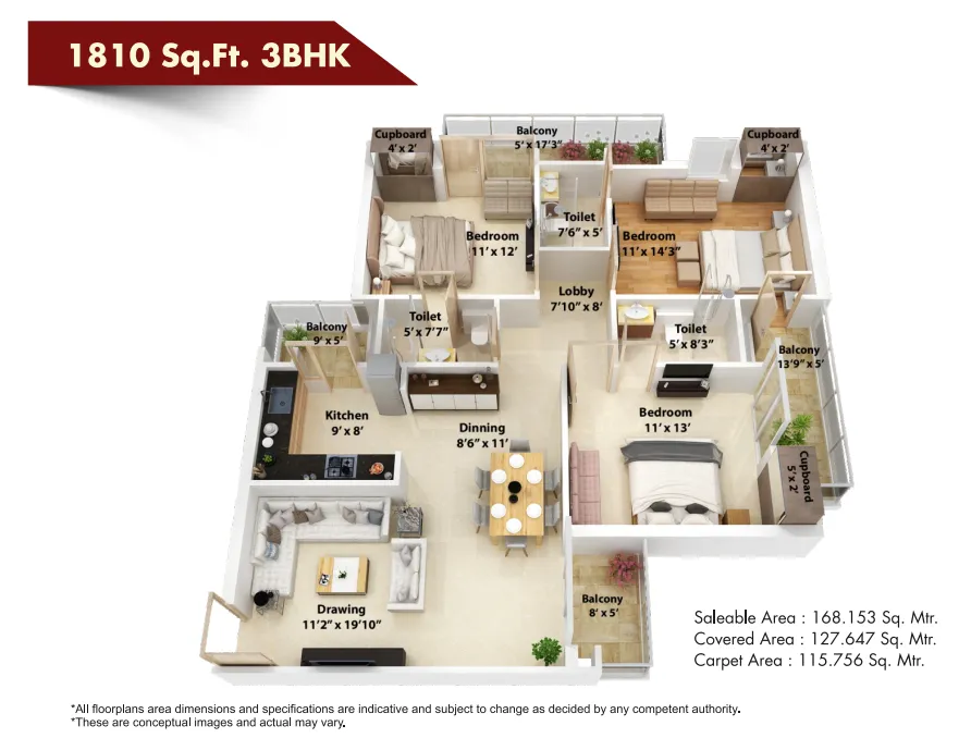 | 3 BHK + 3T | 1810 Sq.Ft |