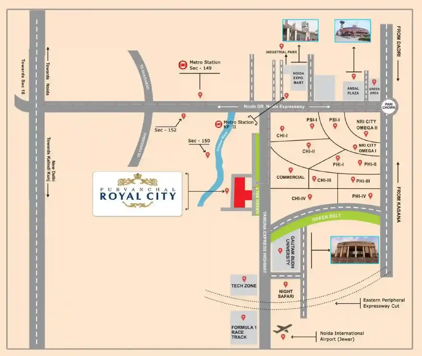 - Purvanchal Royal City is located near Delhi, Noida and Ghaziabad, which makes it easy to travel to these big areas. This is really helpful for commuting and getting around more easily.