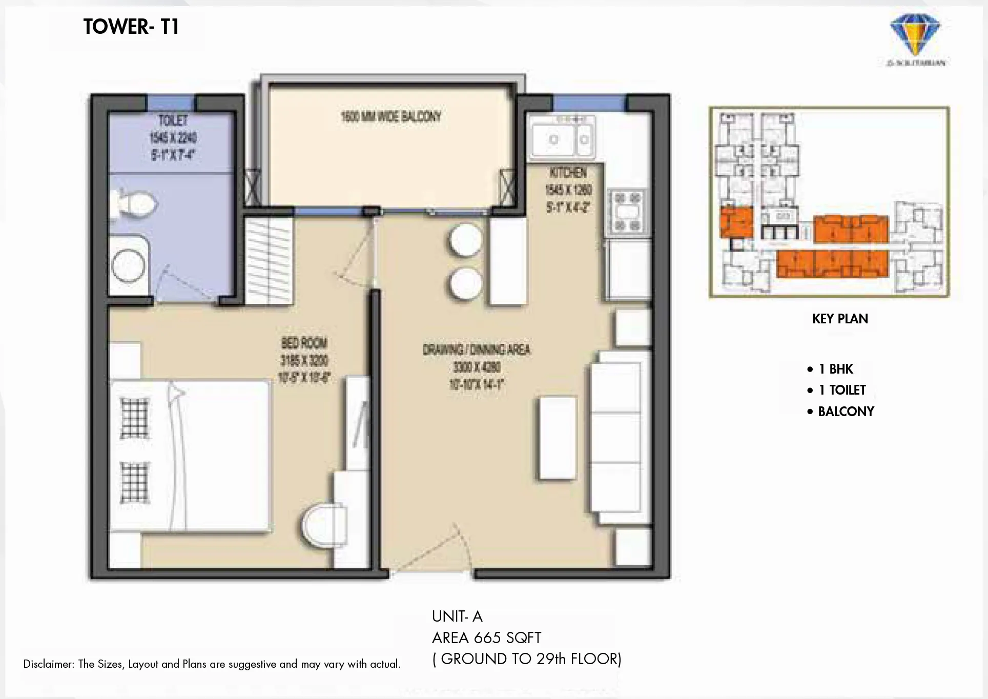 | 1 BHK + 1T | 665 Sq.Ft | |