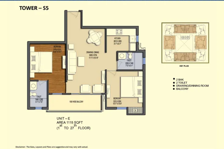 | 2 BHK + 2T | 1115 Sq.Ft | |