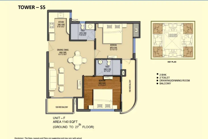| 2 BHK + 2T | 1140 Sq.Ft | |